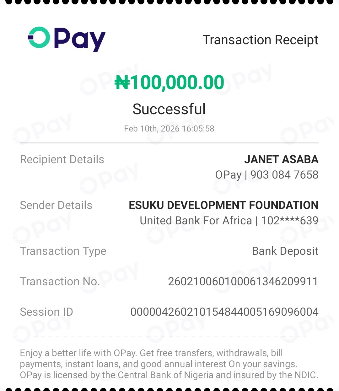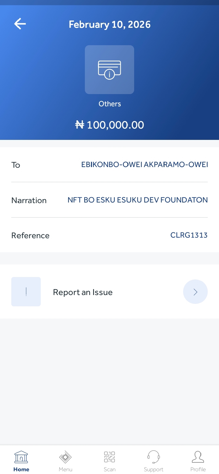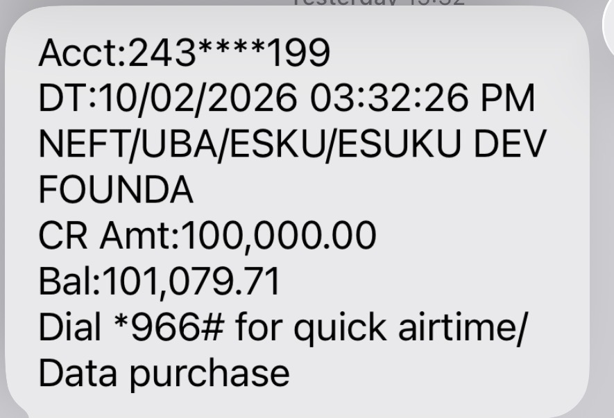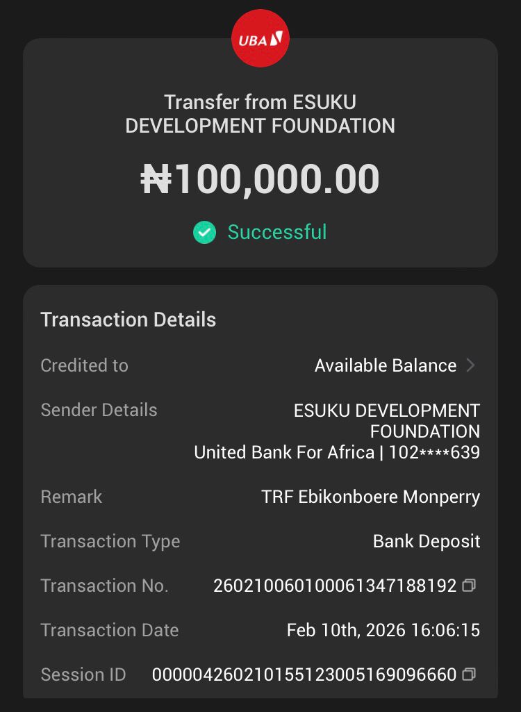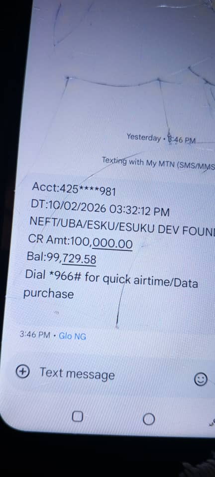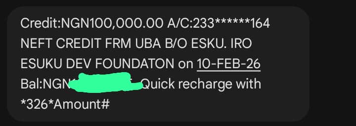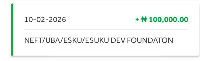 With my whole heart laid out, I write to express my gratitude for the privilege accorded to me by the ESUKU DEVELOPMENT FOUNDATION and its entire TEAM to be a favoured beneficiary for the sponsorship of my school fees payment with a wholesome sum of #100,000. I am so grateful for this opportunity and I pledge to make good use out of it. THANK YOU SO MUCH, I PRAY GOD BLESSES THE GOOD HEART BEHIND THIS FOUNDATION, AMEN